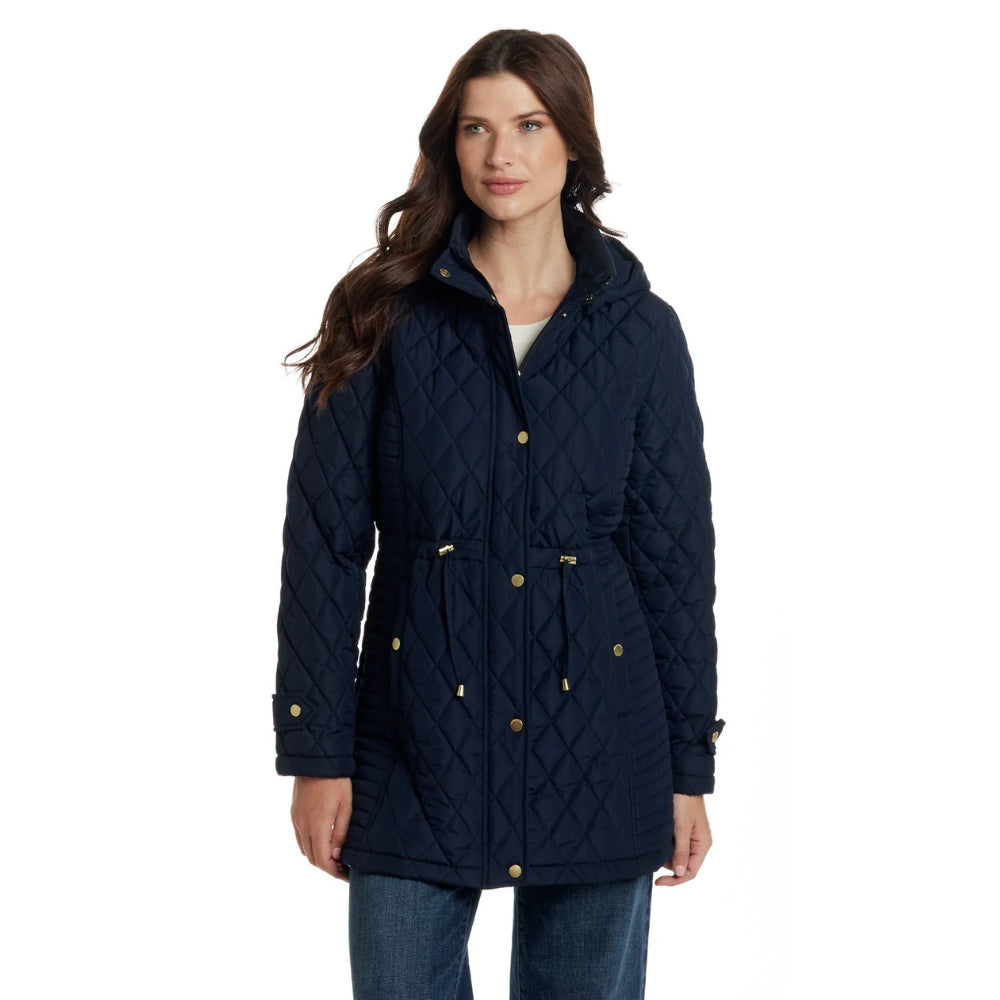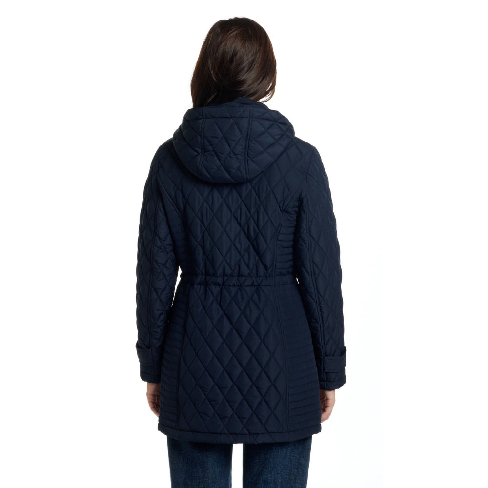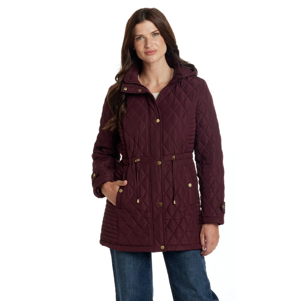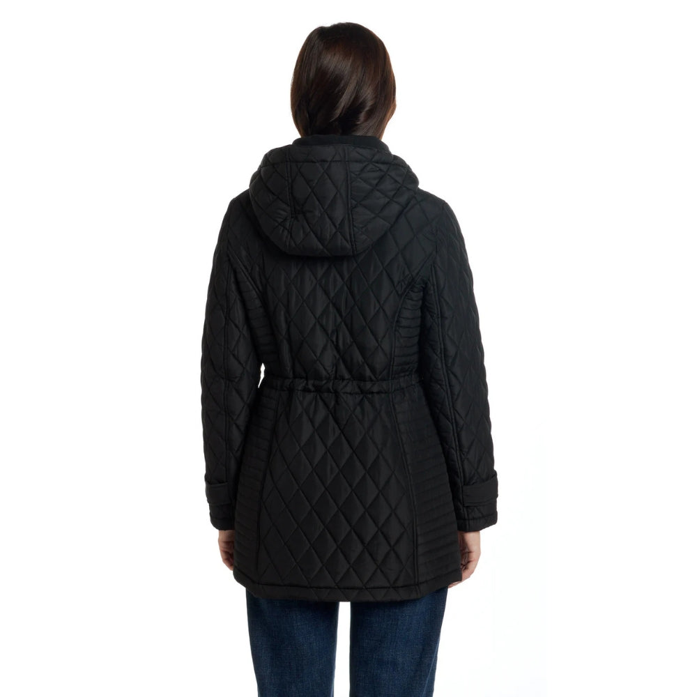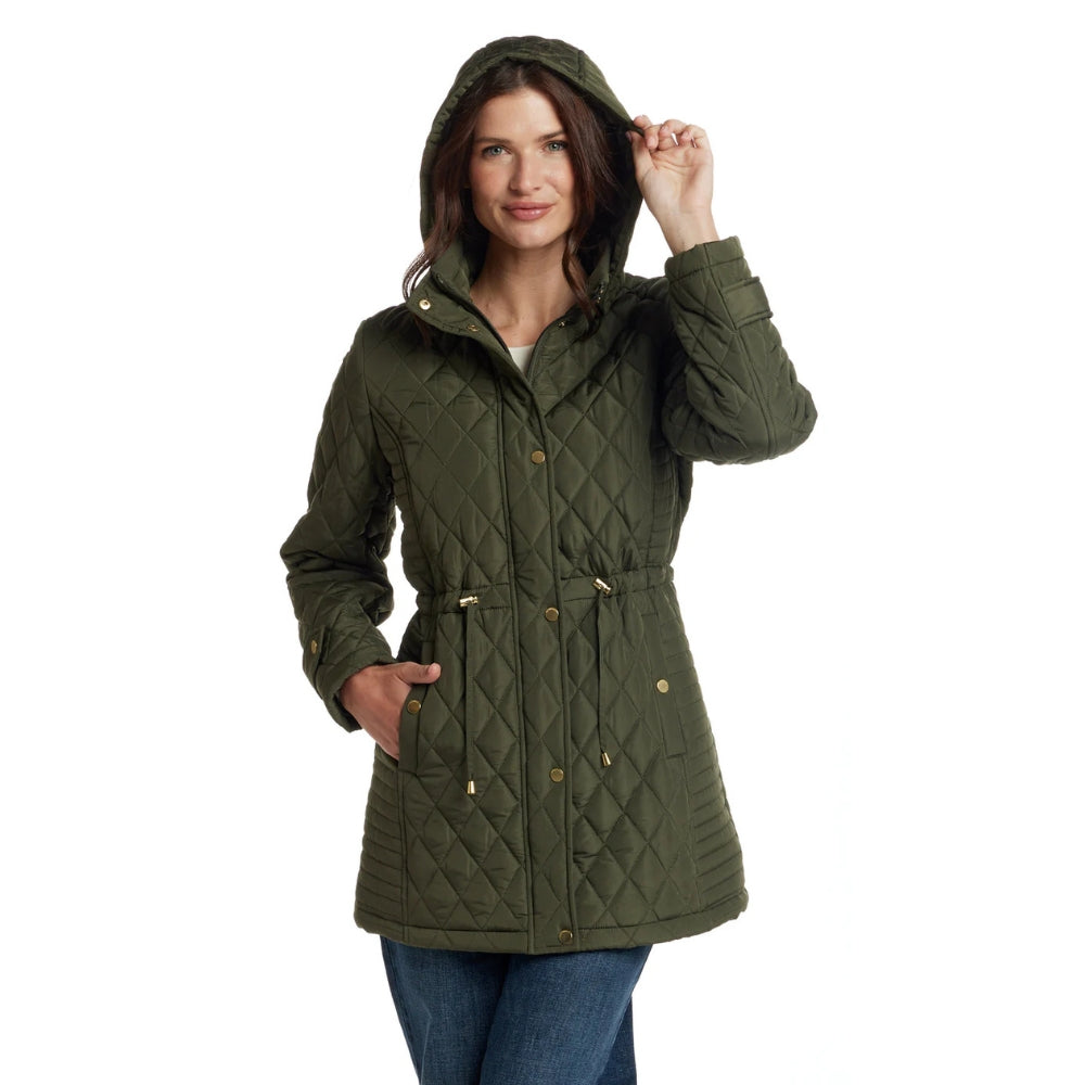 Elle est dotée de poches à boutons-pression, d'une capuche amovible pour un style polyvalent et d'une taille ajustable pour une silhouette féminine et cintrée.
