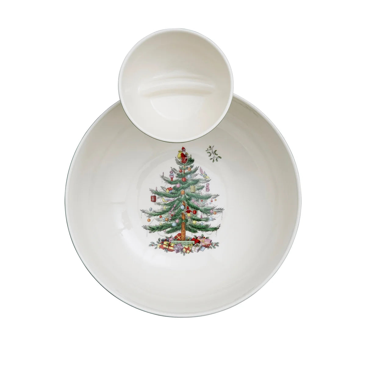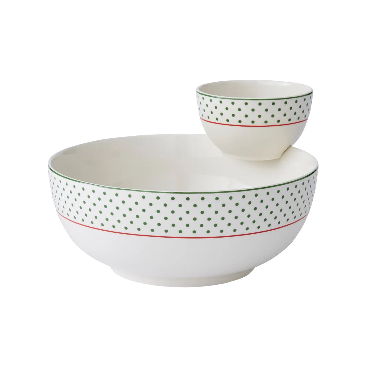 • This festive chip and dip set holds the dip bowl neatly above a generously sized main bowl, great for piling high with tortilla or pita chips for a crowd.